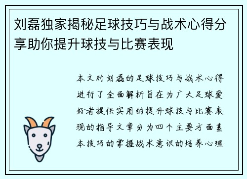 本文围绕“北京足球队中路突破战术解析与未来发展展望”这一主题进行深入探讨。首先,对北京足球队中路突破战术的基本概念及其重要性进行了介绍,指出在现代足球中,中路突破是提升进攻效率、撕裂防线的重要手段。其...